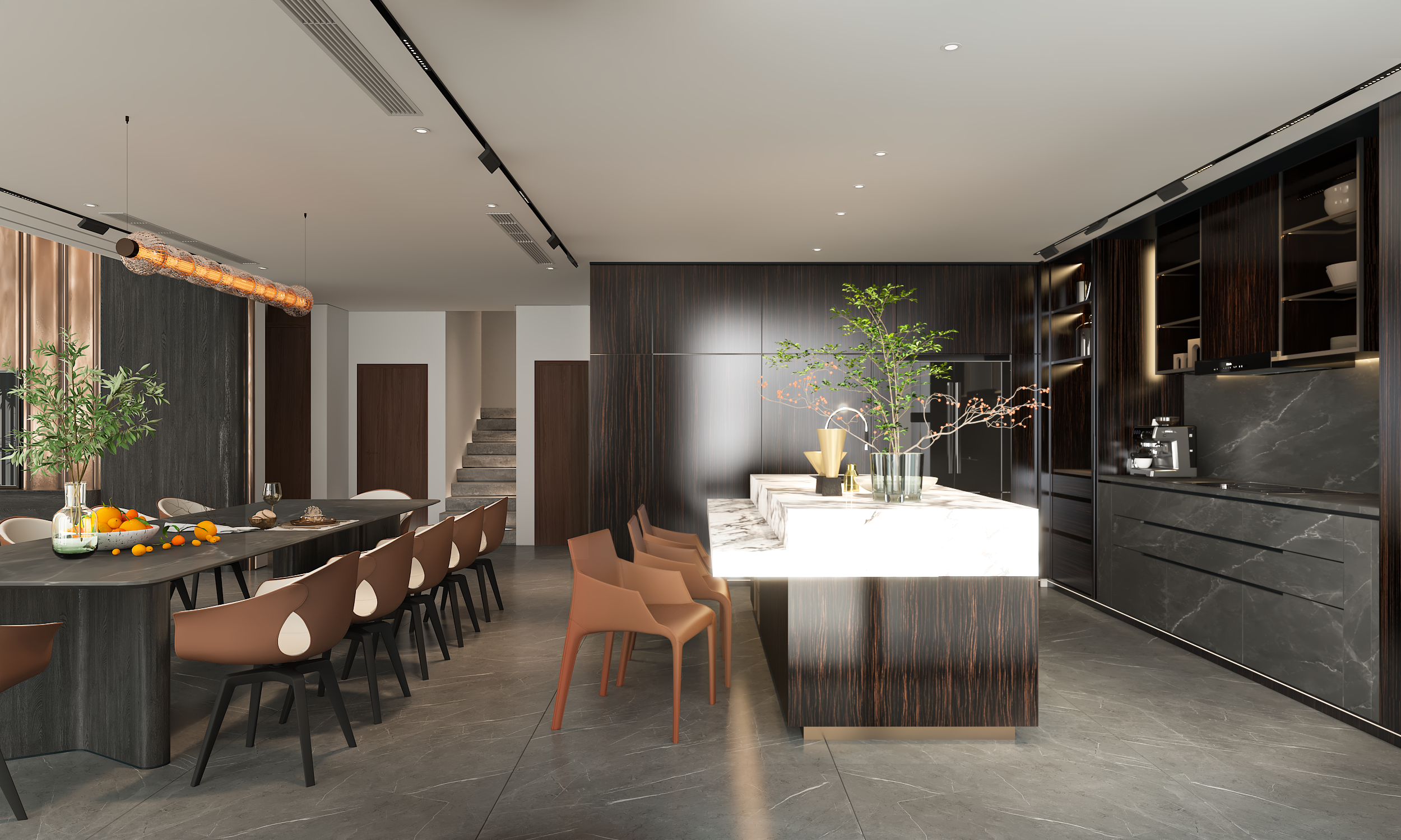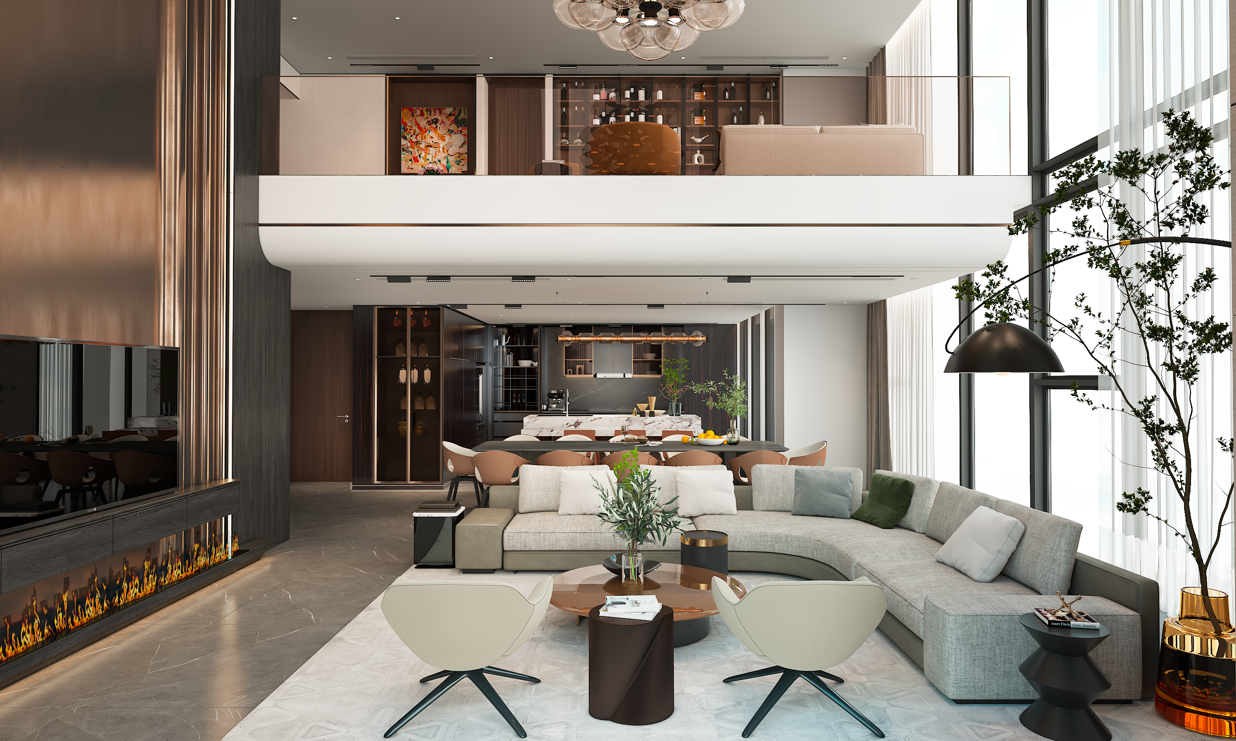 Phòng khách được tổ chức theo bố cục mở với trần cao và mặt kính lớn hướng biển, cho phép tầm nhìn không bị che chắn ra vịnh. Sofa, bàn trà và đồ nội thất lựa chọn tỉ mỉ, kết hợp đá marble và gỗ sẫm màu nhằm tăng cảm giác sang trọng. Khu vực bếp được xử lý bằng đảo đá marble liền khối, bàn ăn dài và hệ tủ tối giản, đảm bảo công năng và duy trì sự tinh tế.
