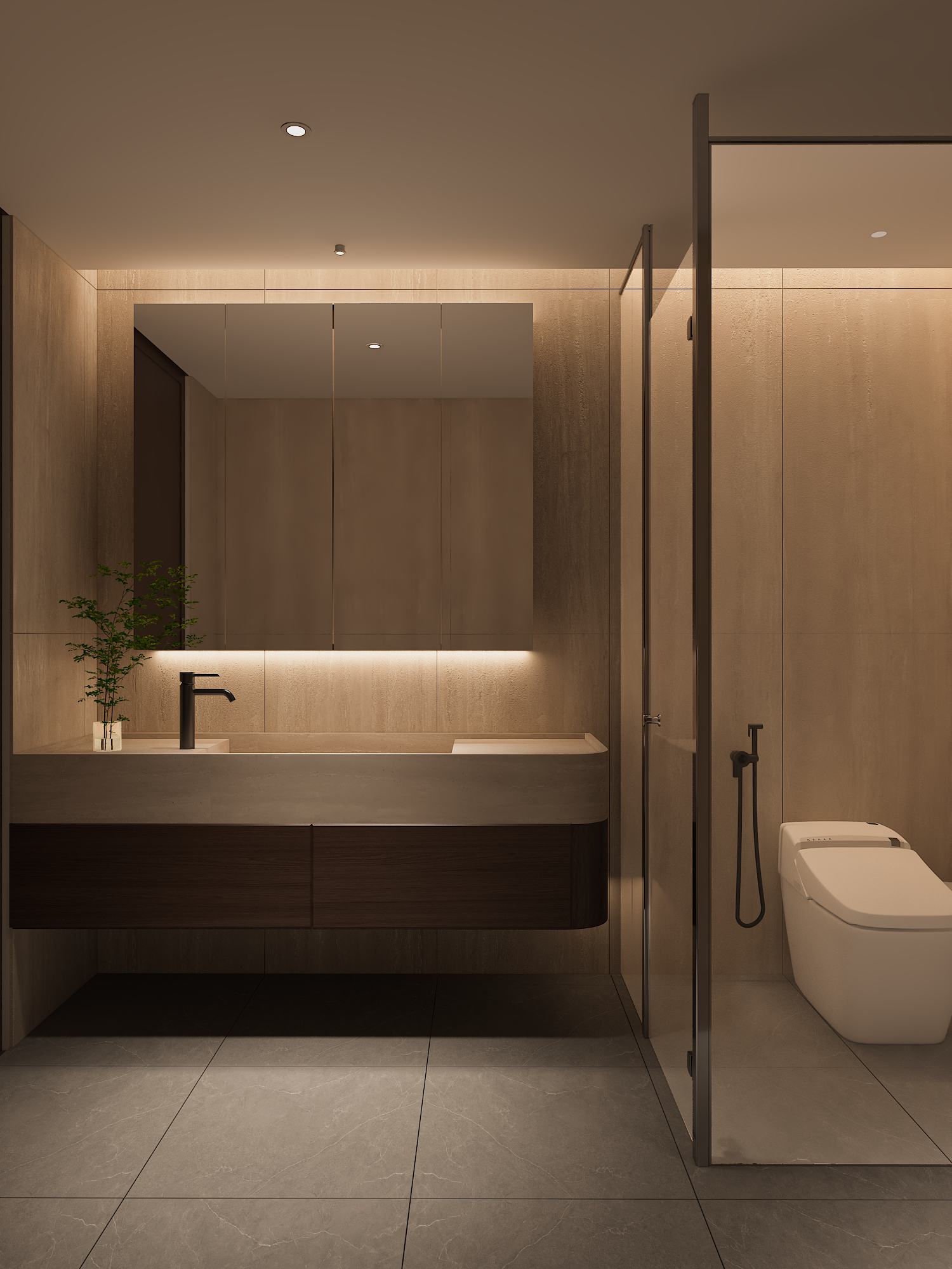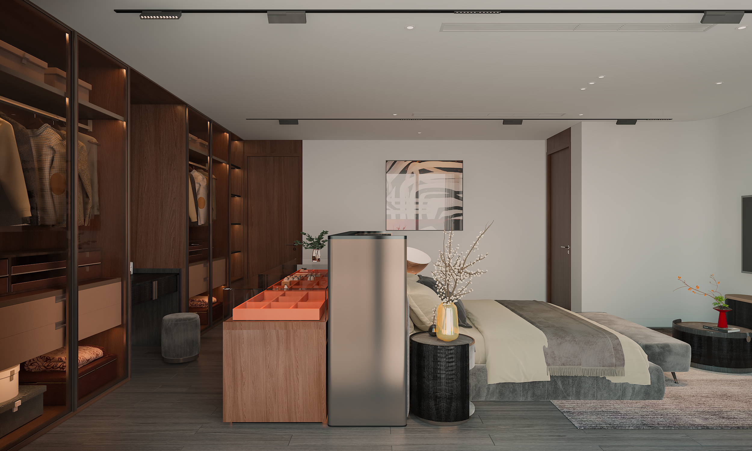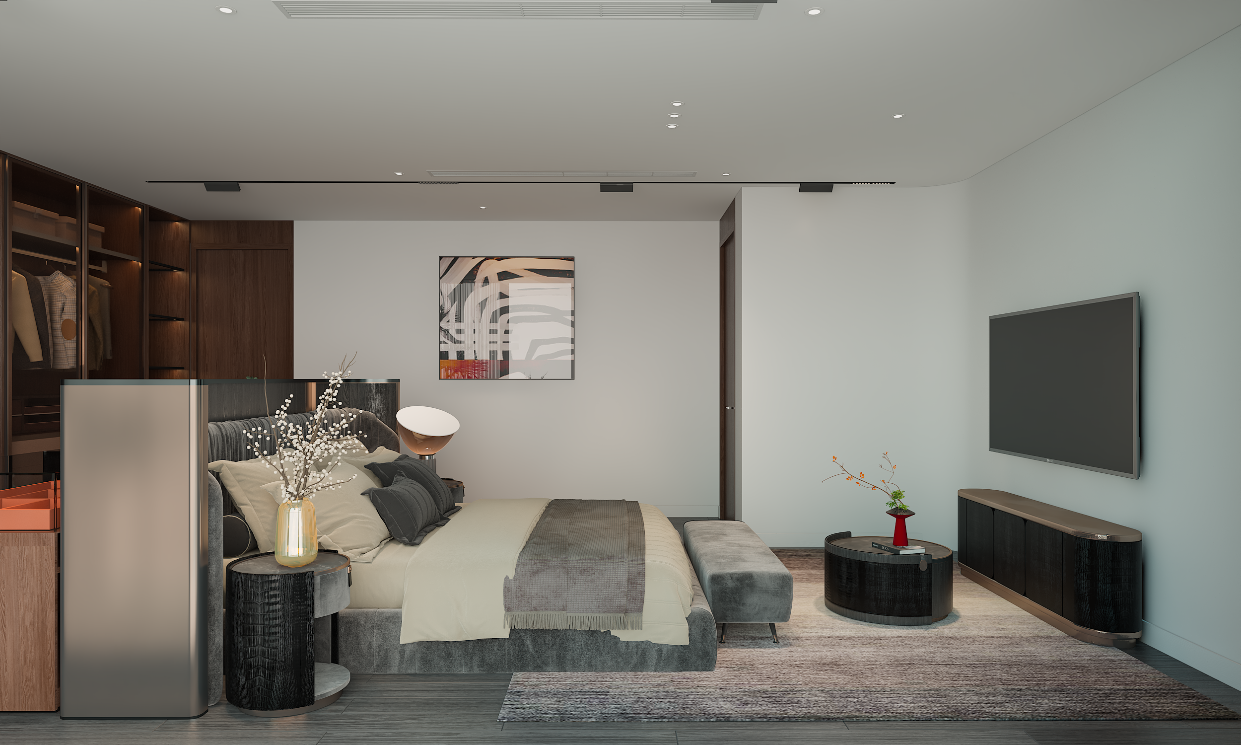 Phòng ngủ được thiết kế theo phong cách tối giản, sử dụng gỗ và vật liệu tối màu làm chủ đạo. Giường bọc nệm, tủ mở và hệ thống ánh sáng gián tiếp được sắp đặt khoa học, giữ sự gọn gàng và tiện nghi. Cửa kính lớn khai thác triệt để ánh sáng tự nhiên, đồng thời duy trì sự riêng tư cần thiết.