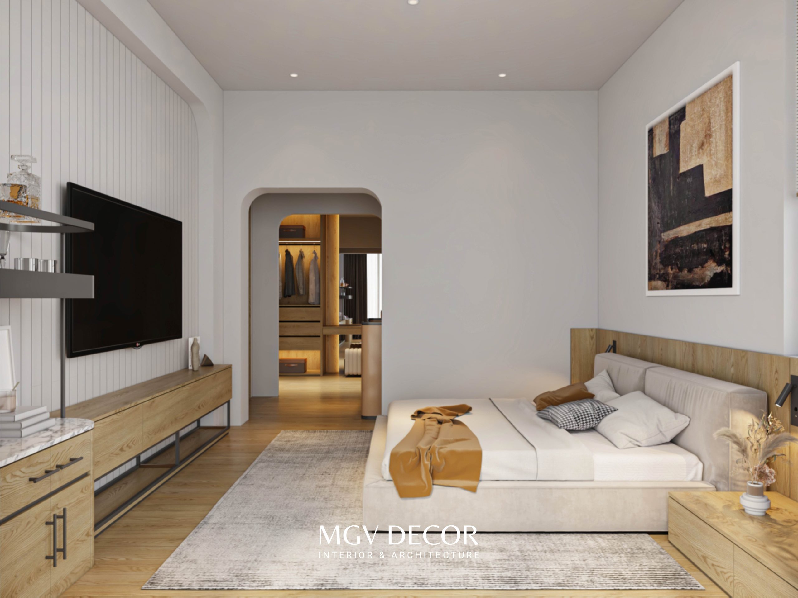 Sự Thư giãn: Phòng ngủ tiếp tục sử dụng tông màu dịu nhẹ, tập trung vào tiện nghi thư giãn tuyệt đối.