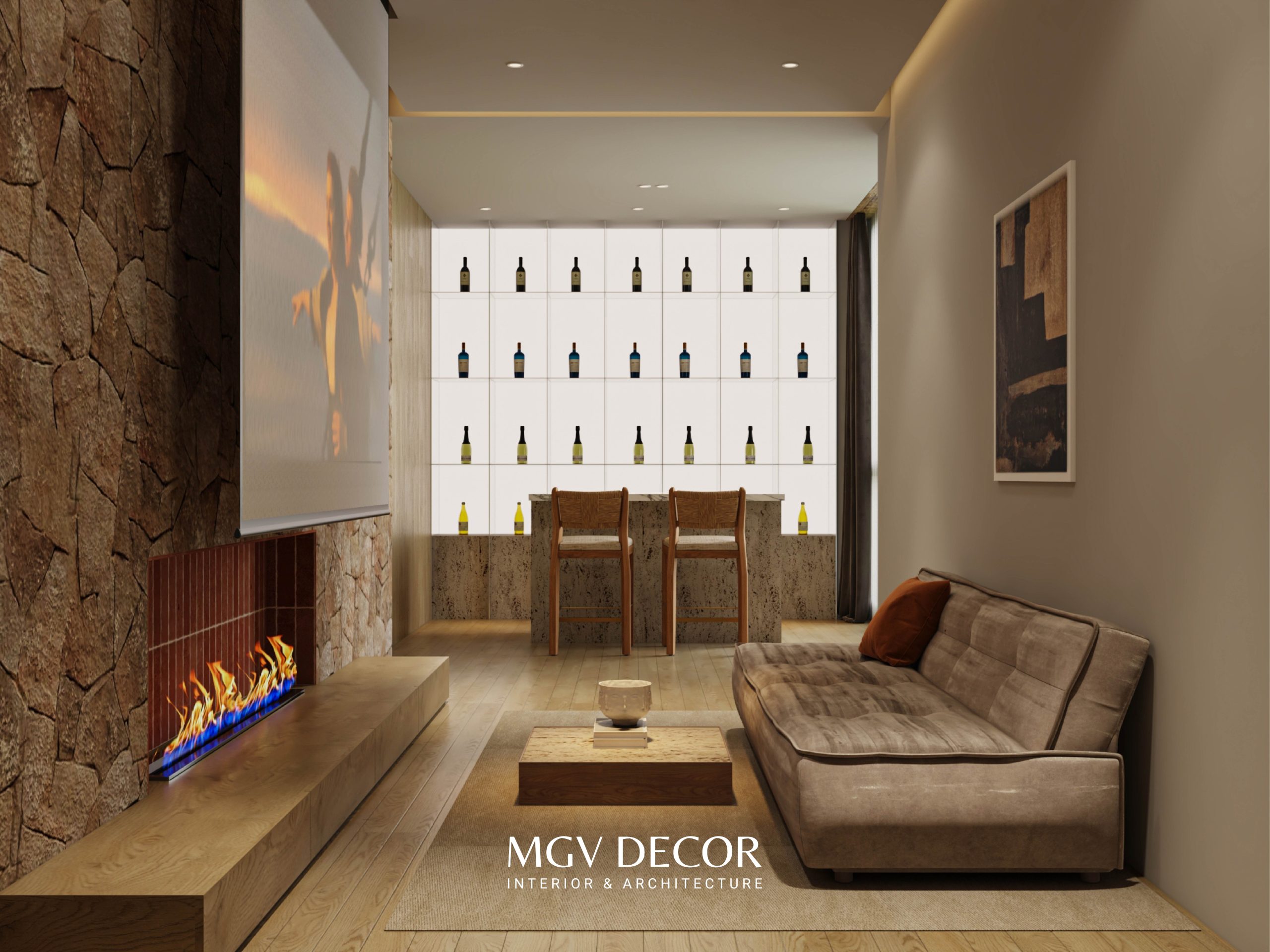 Điểm nhấn Giải trí: Khu vực giải trí riêng tư với lò sưởi ốp đá thô và màn chiếu. Không gian này được thiết kế để gia chủ tìm lại bình yên và tái tạo năng lượng hiệu quả, với tiếng thông reo làm nhạc nền.