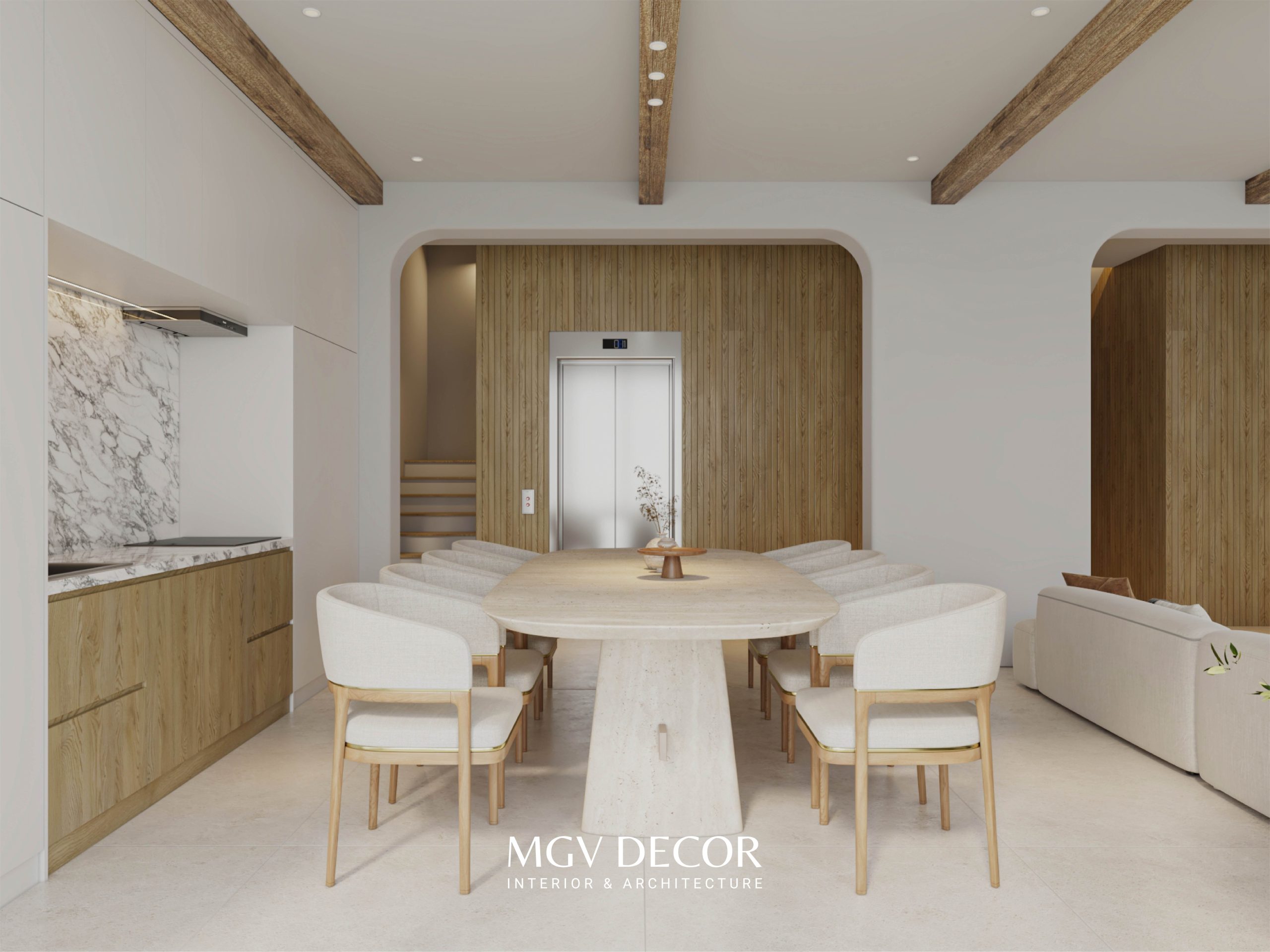 Cảm hứng & Vật liệu: Tông màu be, kem và nâu gỗ sáng, kết hợp dầm gỗ thô trên trần, tạo nên sự giao thoa hoàn hảo giữa nội thất và cảnh sắc Thanh Xuan Valley bên ngoài. Ánh sáng tự nhiên và thiết kế mở là yếu tố then chốt để mang không khí trong lành của đồi thông vào nhà.