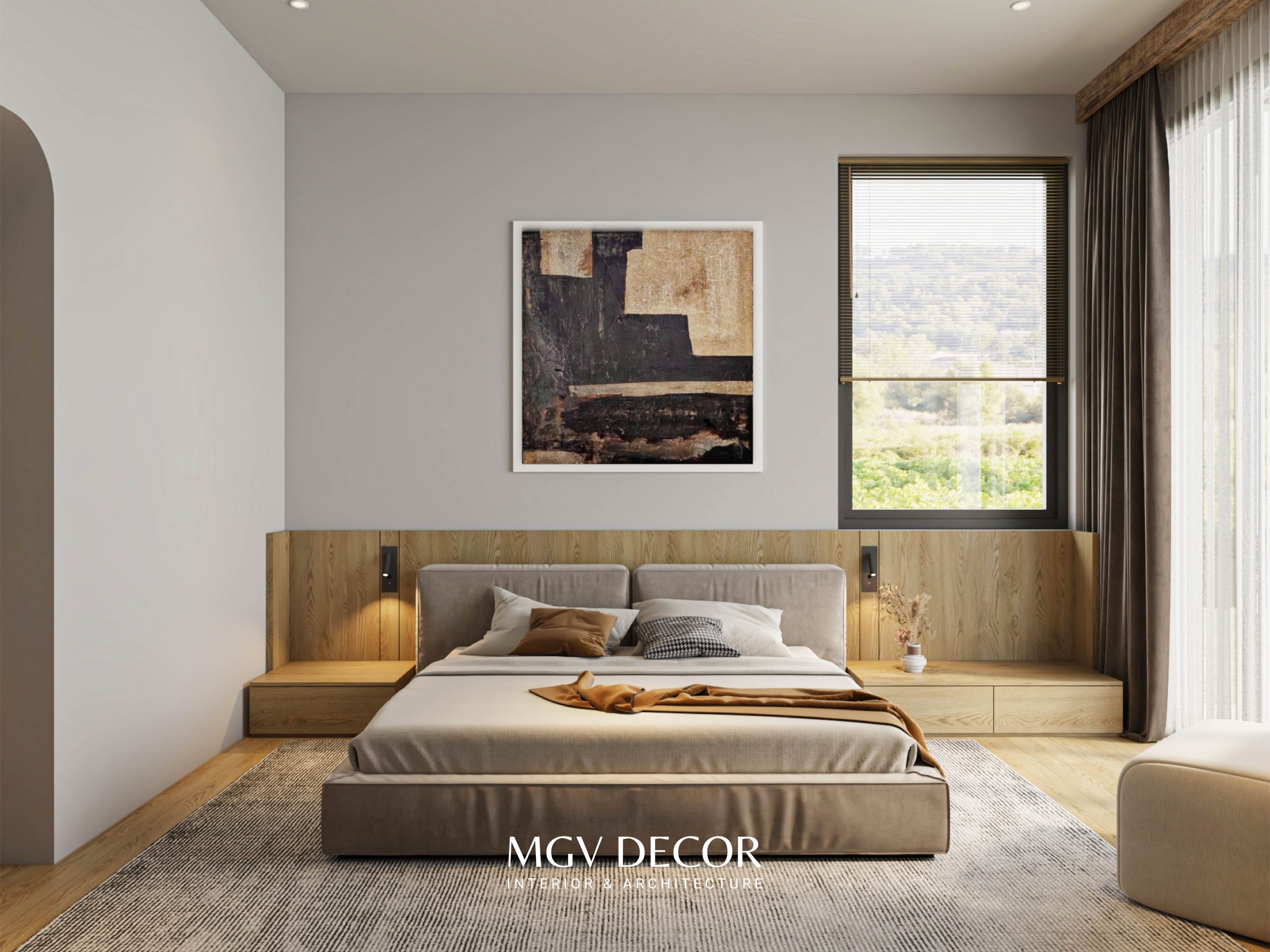 Sự Thư giãn: Phòng ngủ tiếp tục sử dụng tông màu dịu nhẹ, tập trung vào tiện nghi thư giãn tuyệt đối.