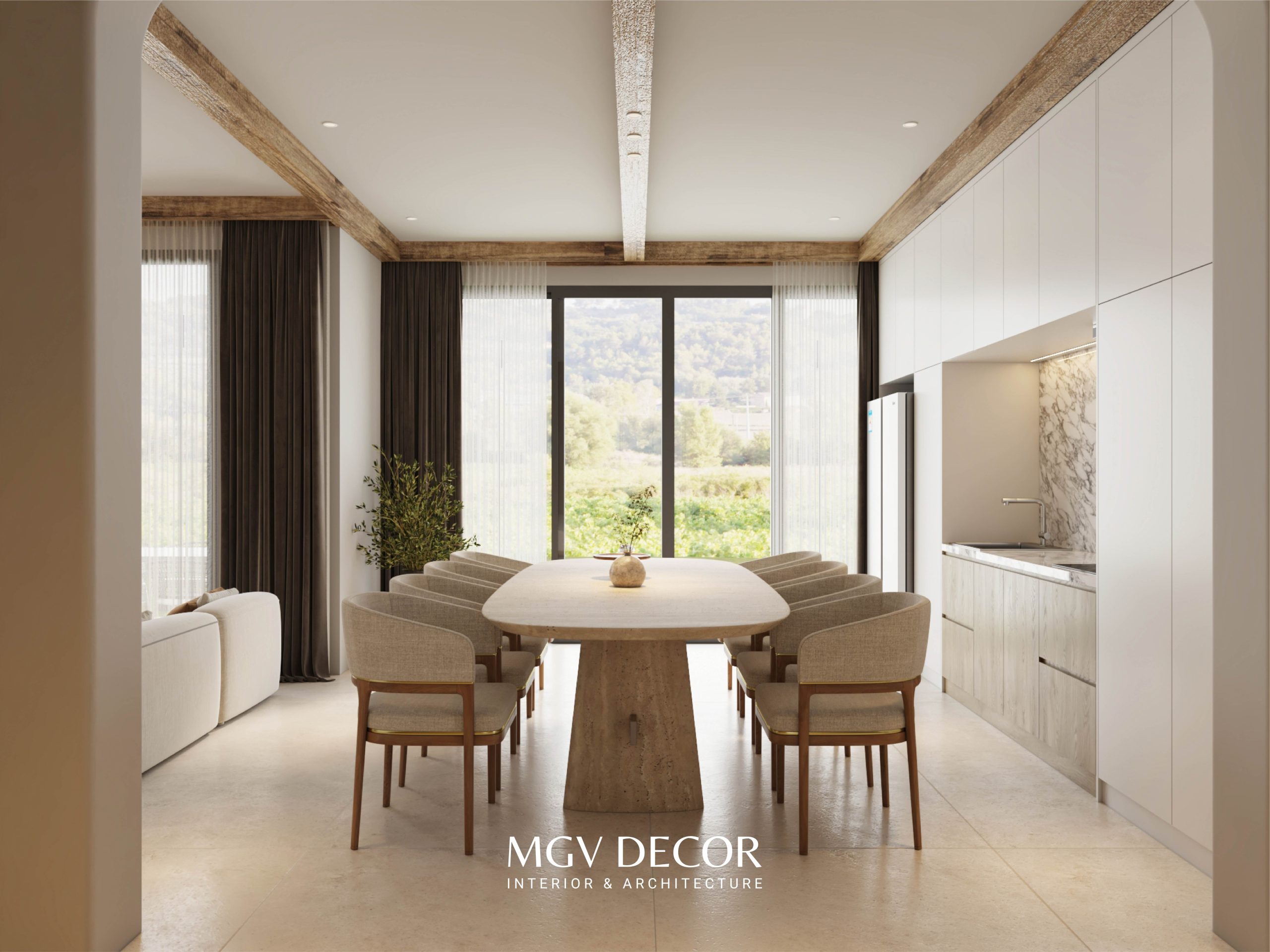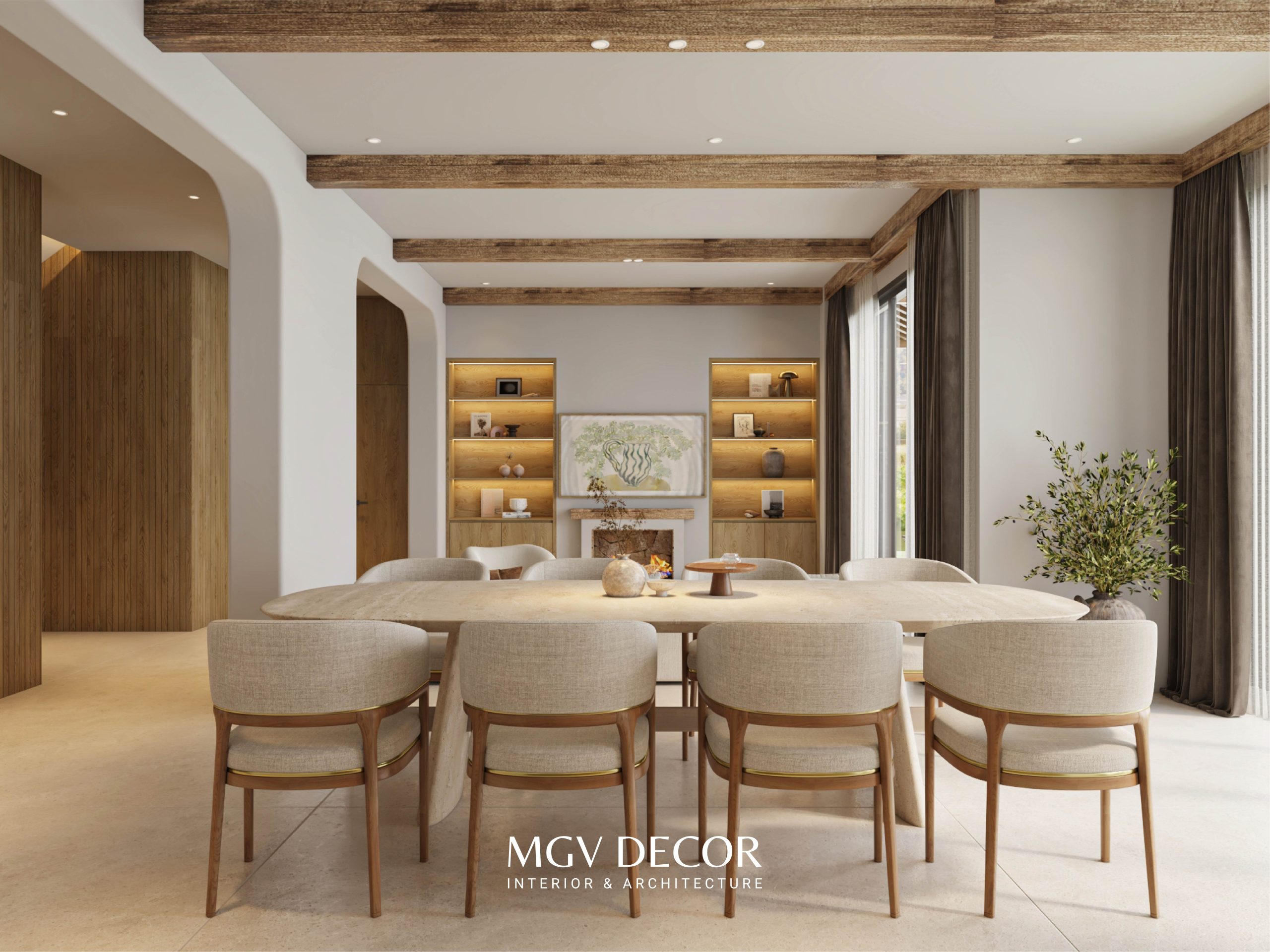 Cảm hứng & Vật liệu: Tông màu be, kem và nâu gỗ sáng, kết hợp dầm gỗ thô trên trần, tạo nên sự giao thoa hoàn hảo giữa nội thất và cảnh sắc Thanh Xuan Valley bên ngoài. Ánh sáng tự nhiên và thiết kế mở là yếu tố then chốt để mang không khí trong lành của đồi thông vào nhà.